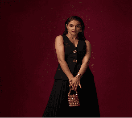 At the Bvlgari exhibition in Mumbai, Genelia Deshmukh captivated attendees in a structured black maxi dress by Forever New. The ensemble featured a tailored vest bodice adorned with oversized gold buttons, transitioning into a fluid, pleated skirt. She paired the look with black pumps, a gold beaded potli from Ruby’s Boutique, and rosette-shaped gold earrings. Her sleek side-parted hairstyle, winged eyeliner, and pink lips completed the polished and unfussy styling. Vogue India
